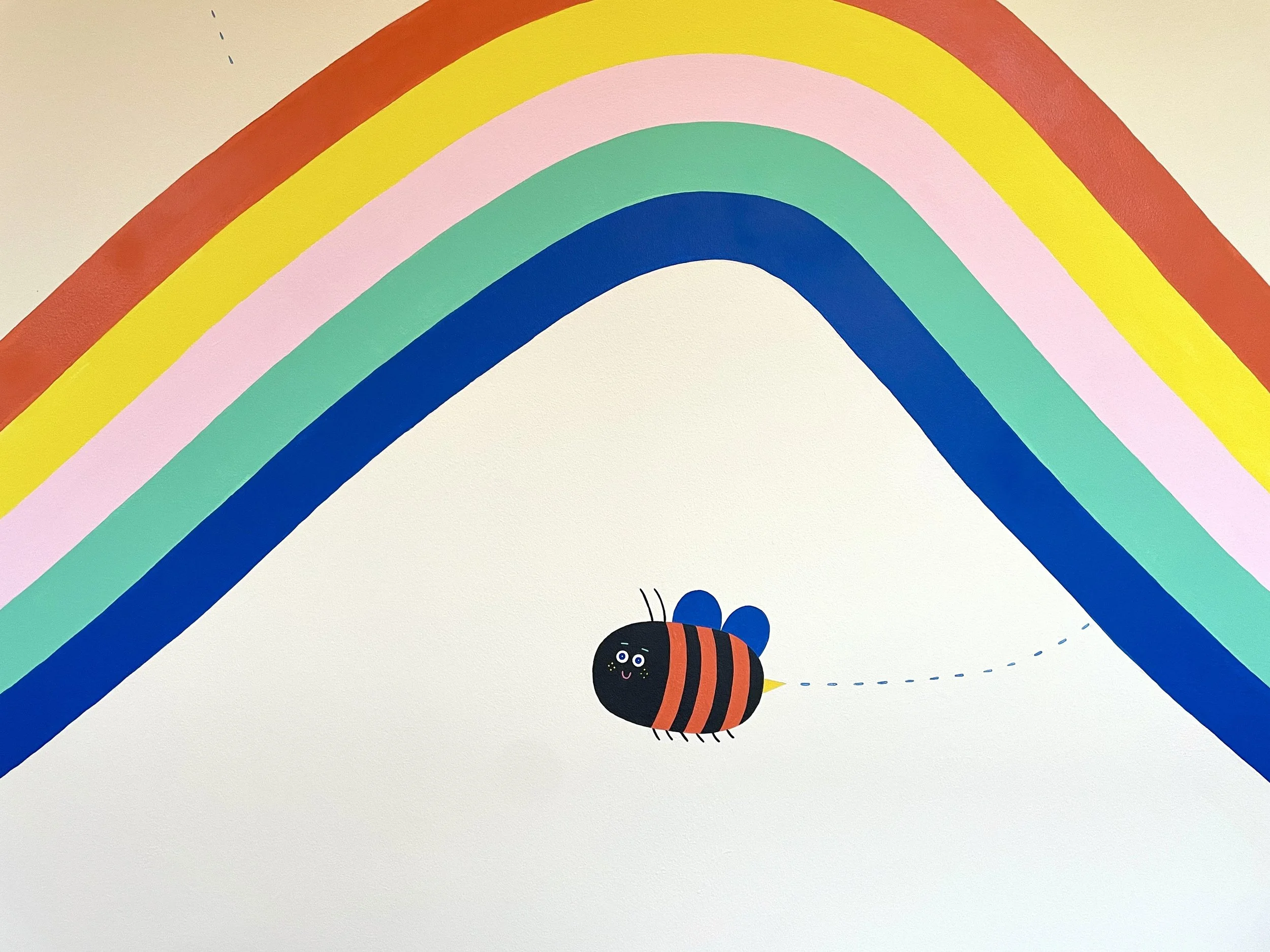 The team wanted a design that would align with their existing brand and logo, but also bring a sense of vibrancy without being "too full-on" for the children. We landed on a sweeping rainbow theme, punctuated by some friendly, chirpy bugs.