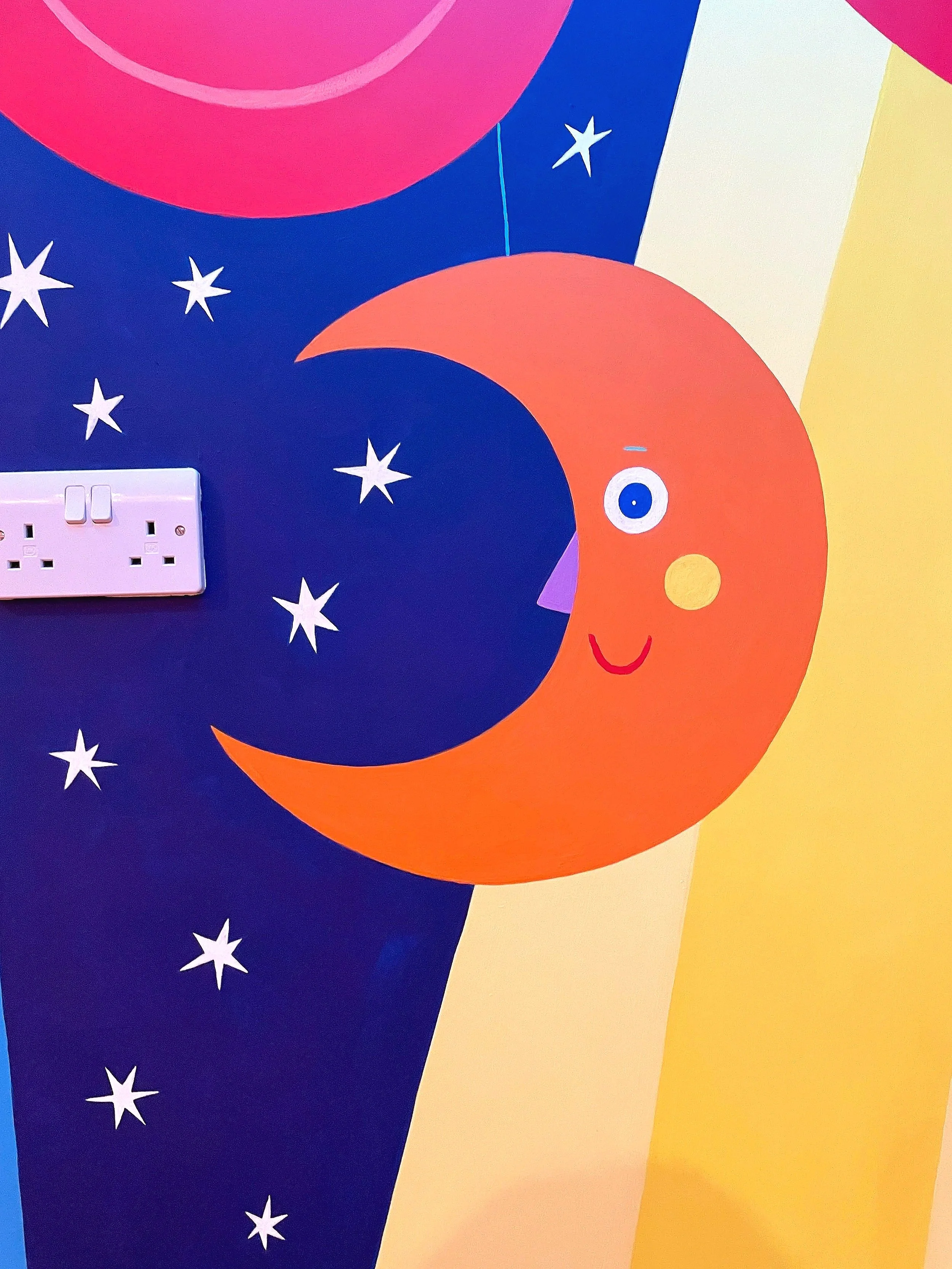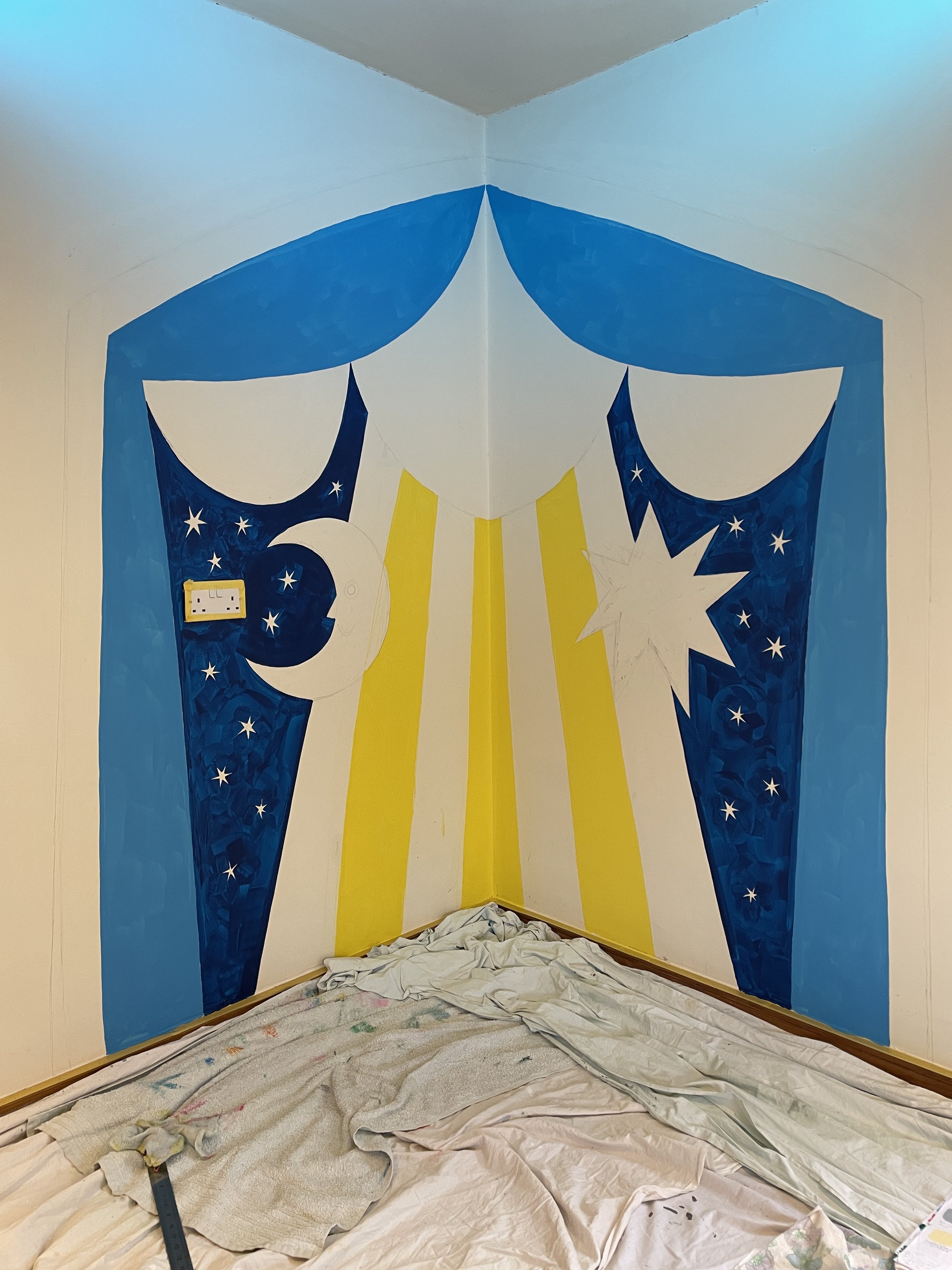 I was tasked with painting a mural of a stage complete with red velvet-style curtains. I wanted to add some extra "dazzle," so I designed the backdrop with little celestial faces - moons and stars - to bring a bit of extra magic to the room. ✨🌛